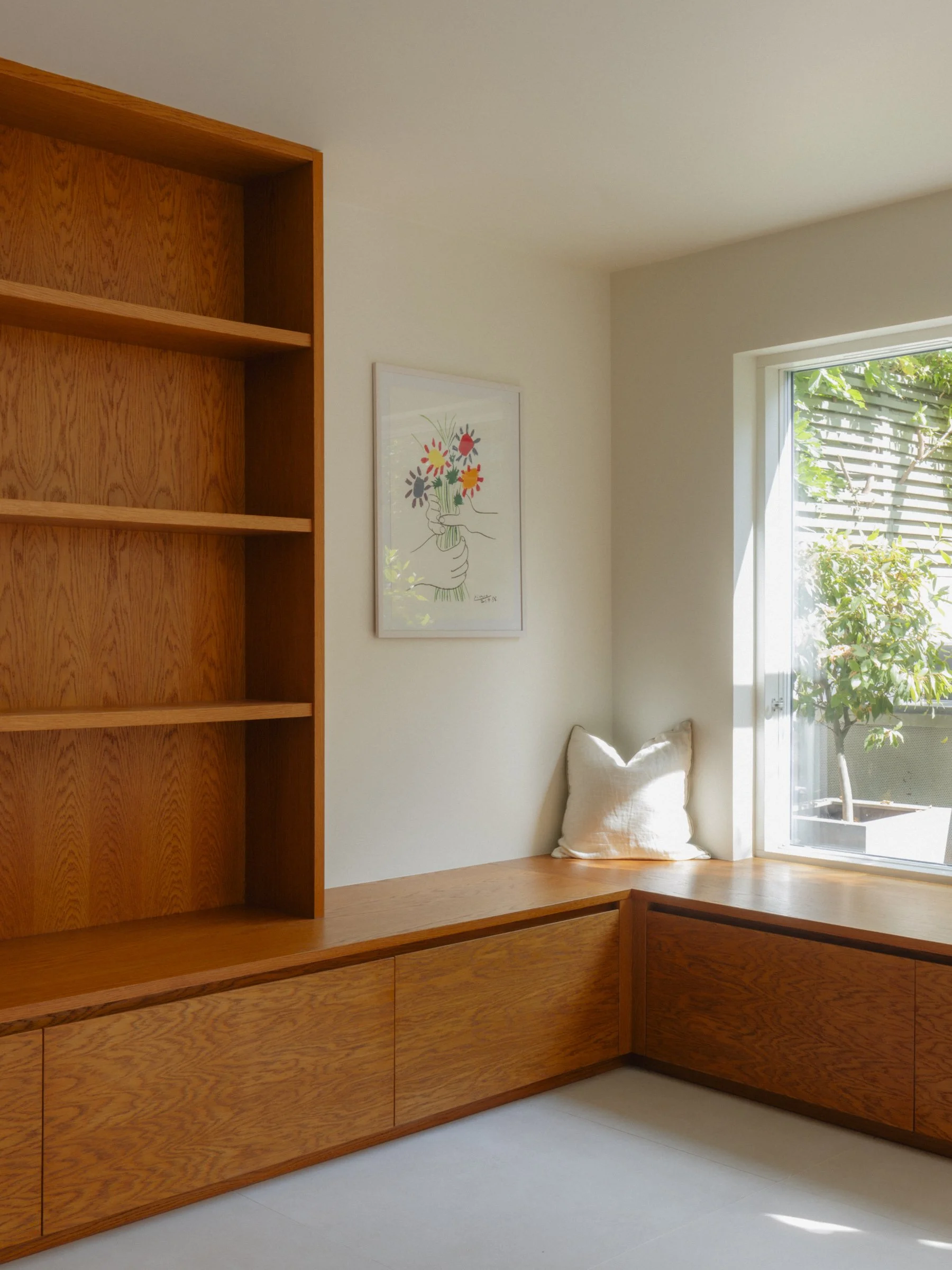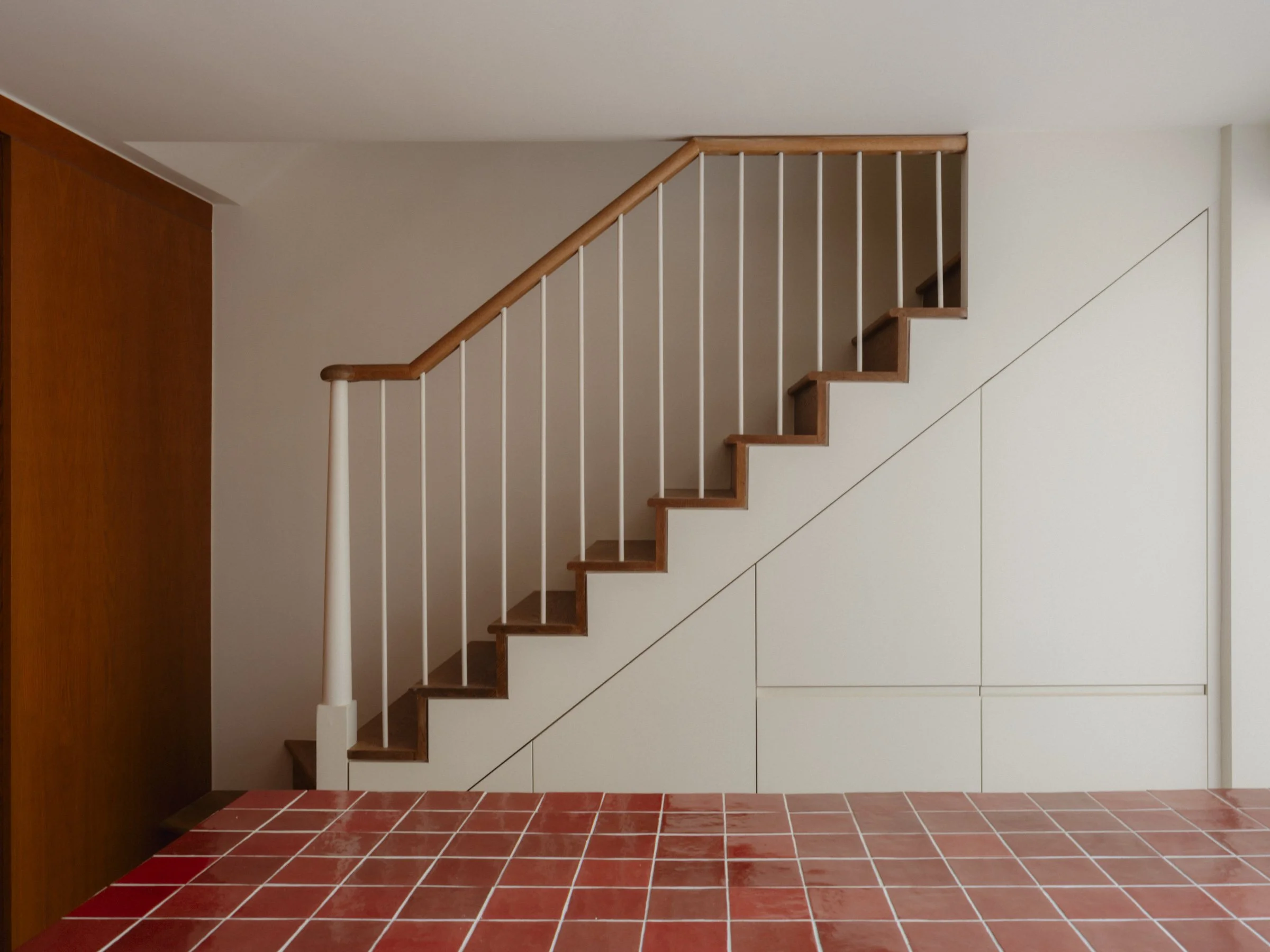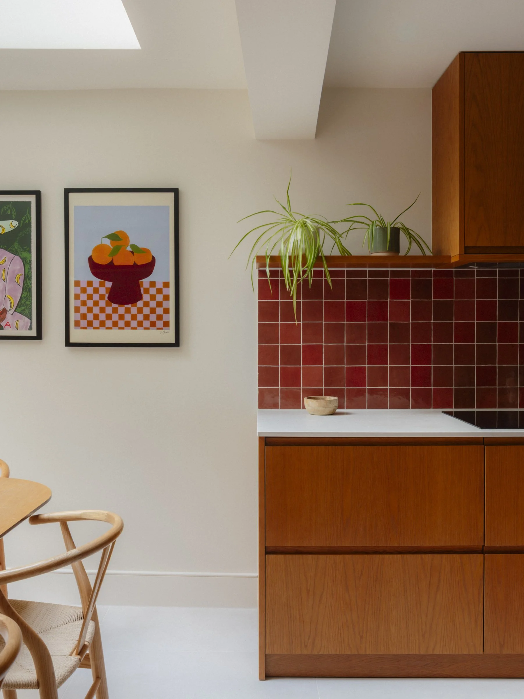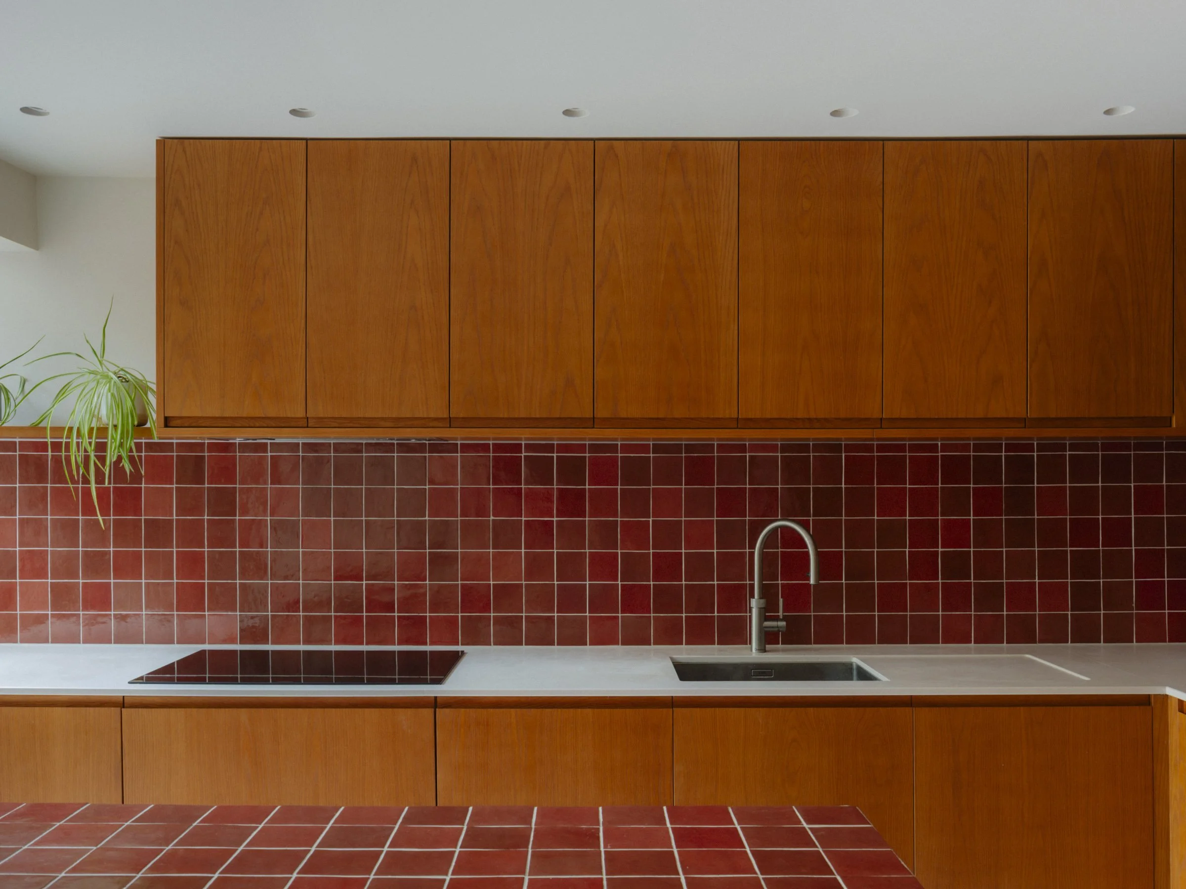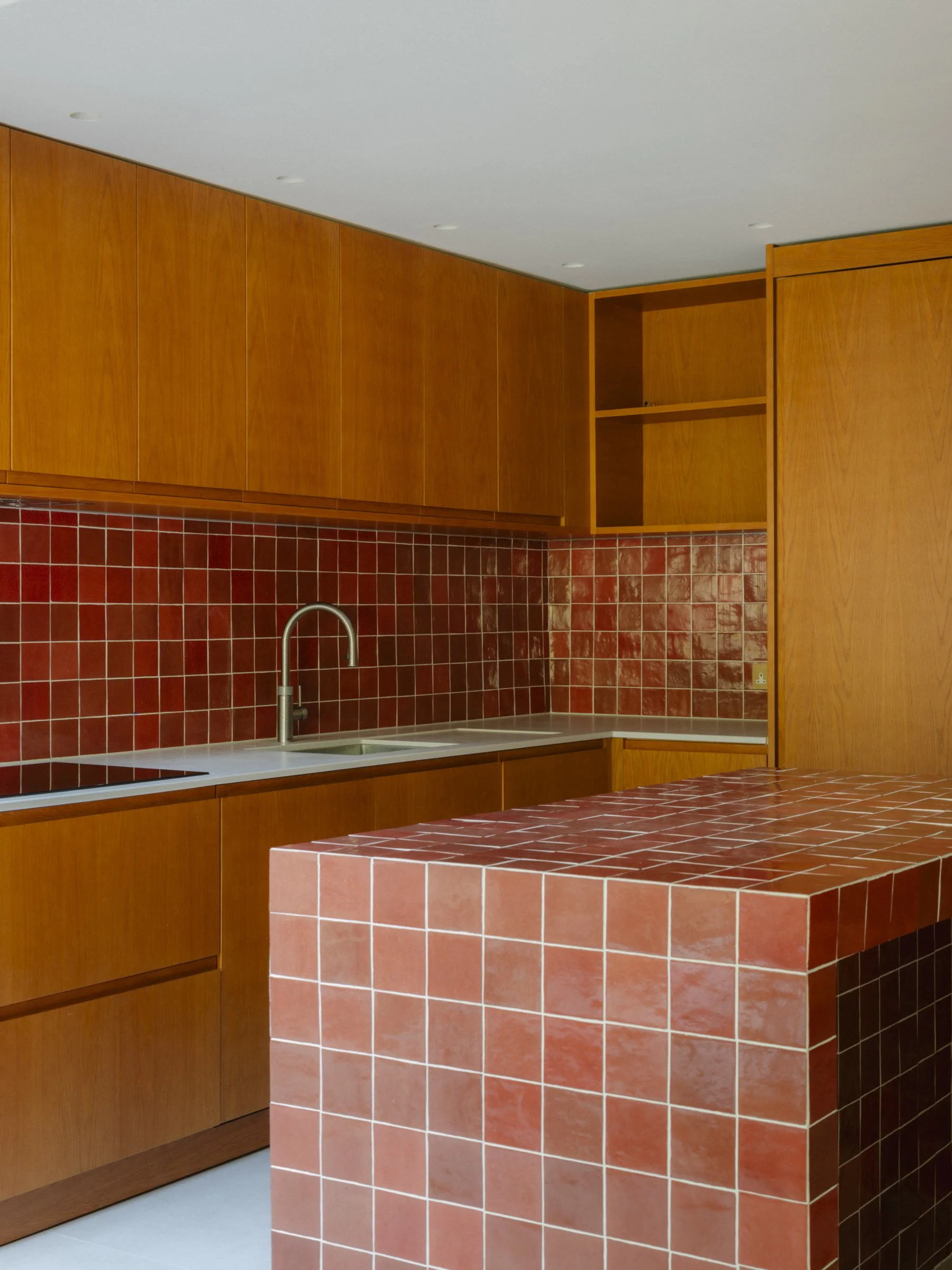 The interior is anchored by bespoke timber joinery finished in rich, deep tones, bringing warmth and character to otherwise pared-back rooms. The kitchen island, clad entirely in bold red tiles, provides a confident focal point, while large-format concrete-effect tiles and oak flooring bring a sense of calm and tactility throughout.