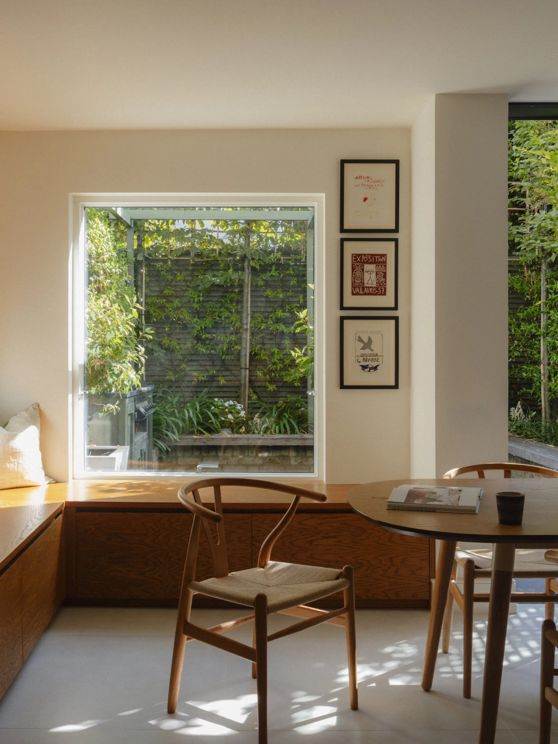 The defining move was to relocate the kitchen and dining area down to the lower ground floor, where a direct relationship with the garden could finally be realised. A large walk-on rooflight floods the space with light from above, while a full-height pivot door and a generous window seat with picture window dissolve what had previously been a hard boundary between inside and out. The lower ground floor also accommodates a guest bedroom with en-suite, utility room, and guest WC — a considered reworking that makes every square foot count.